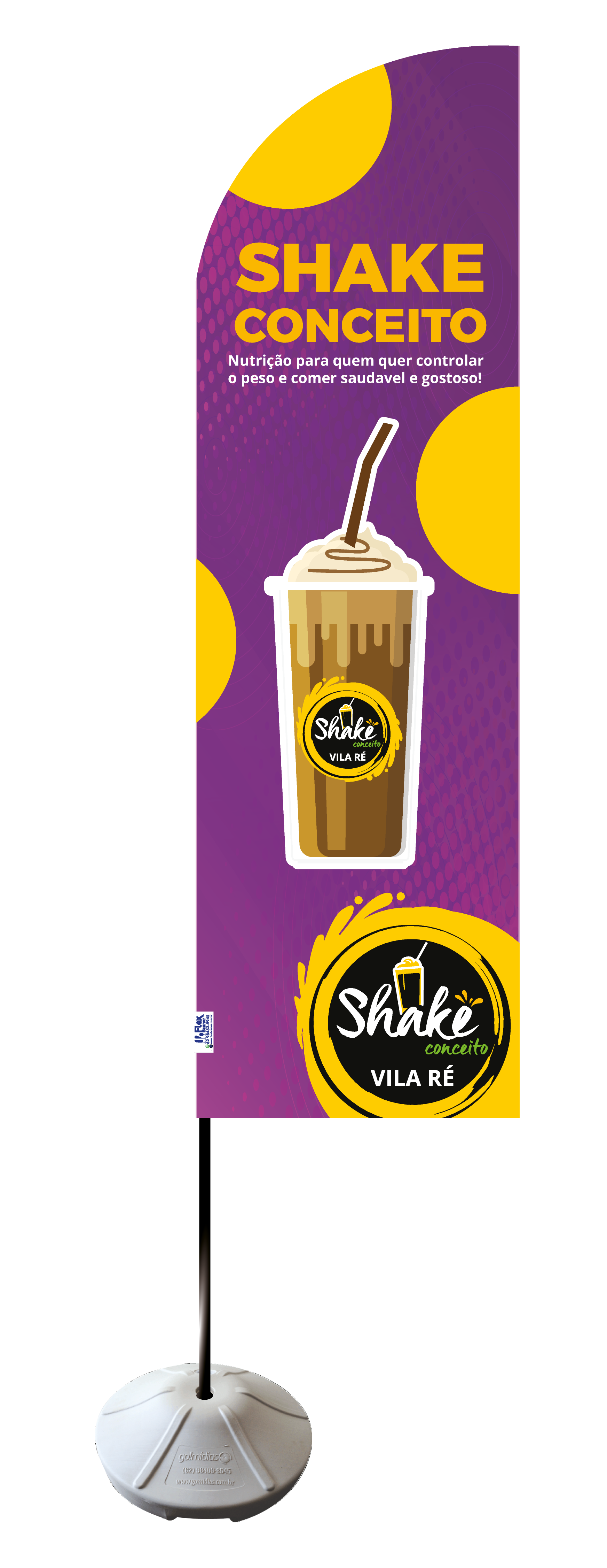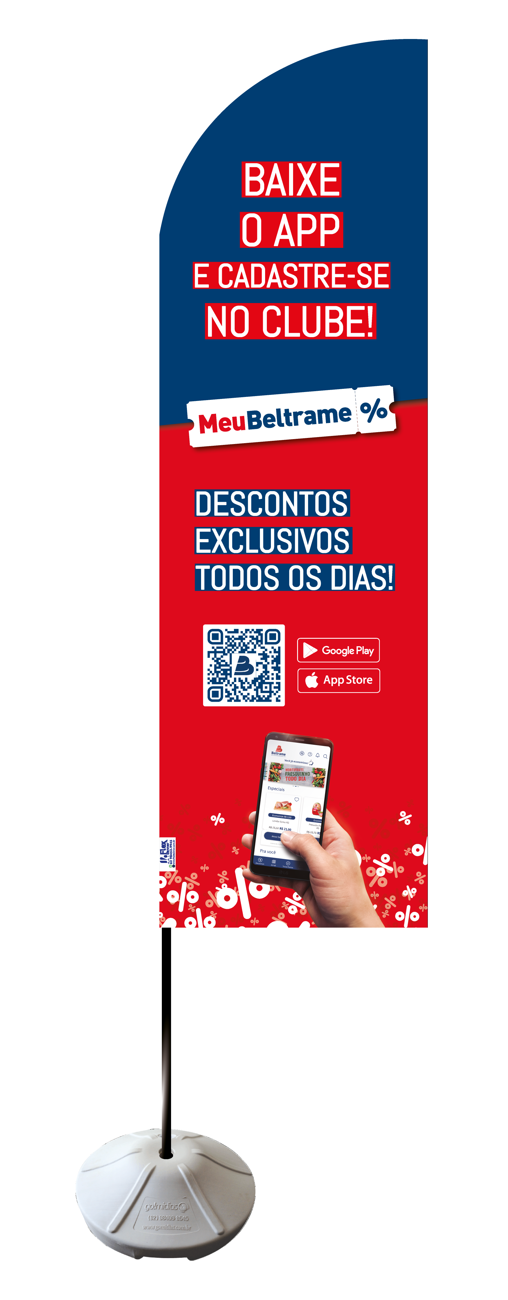 Base de polipropileno, hastes em fibra de vidro desmontáveis, sendo uma ponteira flexível, tecido Oxford reforçado dupla face com impressão digital em sublimação.