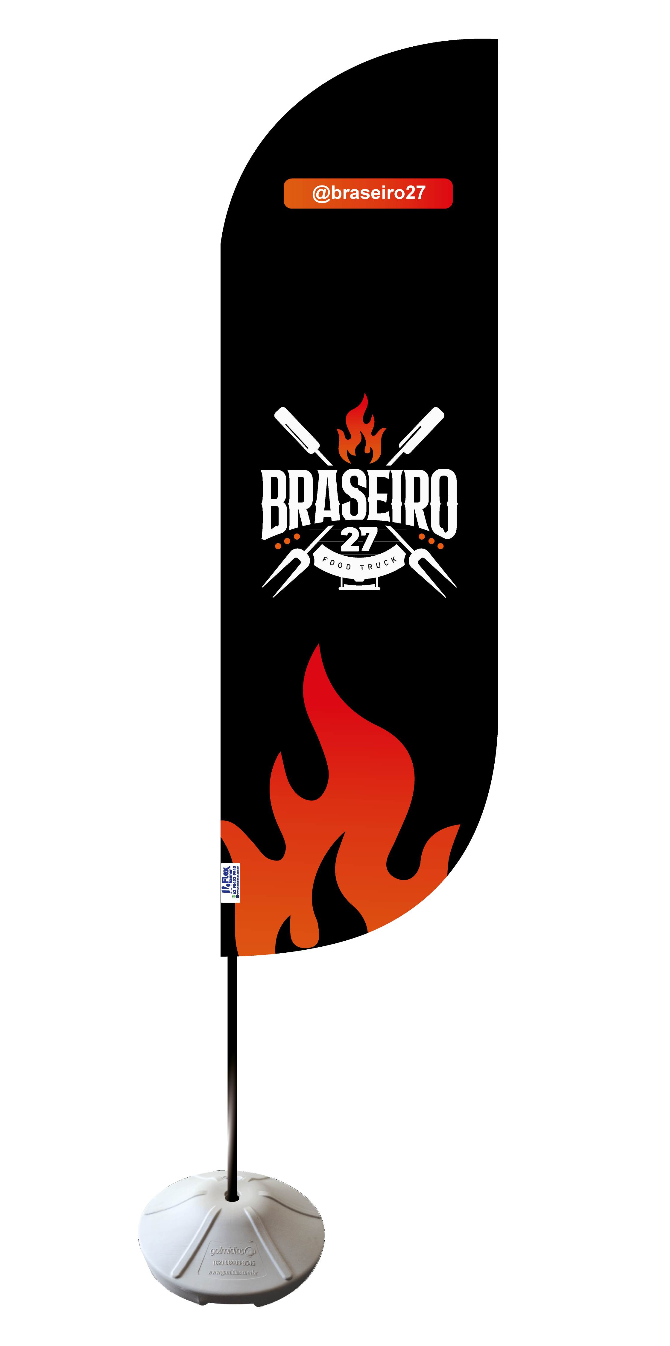 Base de polipropileno, hastes em fibra de vidro desmontáveis, tecido Oxford reforçado dupla face com impressão digital em sublimação.